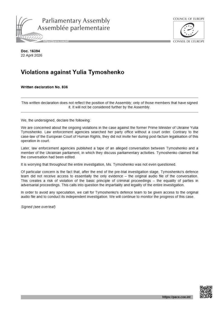 У Парламентська асамблея Ради Європи висловили стурбованість щодо дій антикорупційних органів у справі проти Юлія Тимошенко.